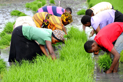 陳華林和專家們來到這個(gè)村,坦桑尼亞coc清關(guān)教當(dāng)?shù)厝朔N地。陳華林和專家們拿長線當(dāng)標(biāo)尺,每約16.5厘米畫上一個(gè)刻度,將長線在田里細(xì)細(xì)拉直,給坦桑尼亞農(nóng)民示范按照間距插秧。又動(dòng)員他們挖水塘,積水來對抗干旱。