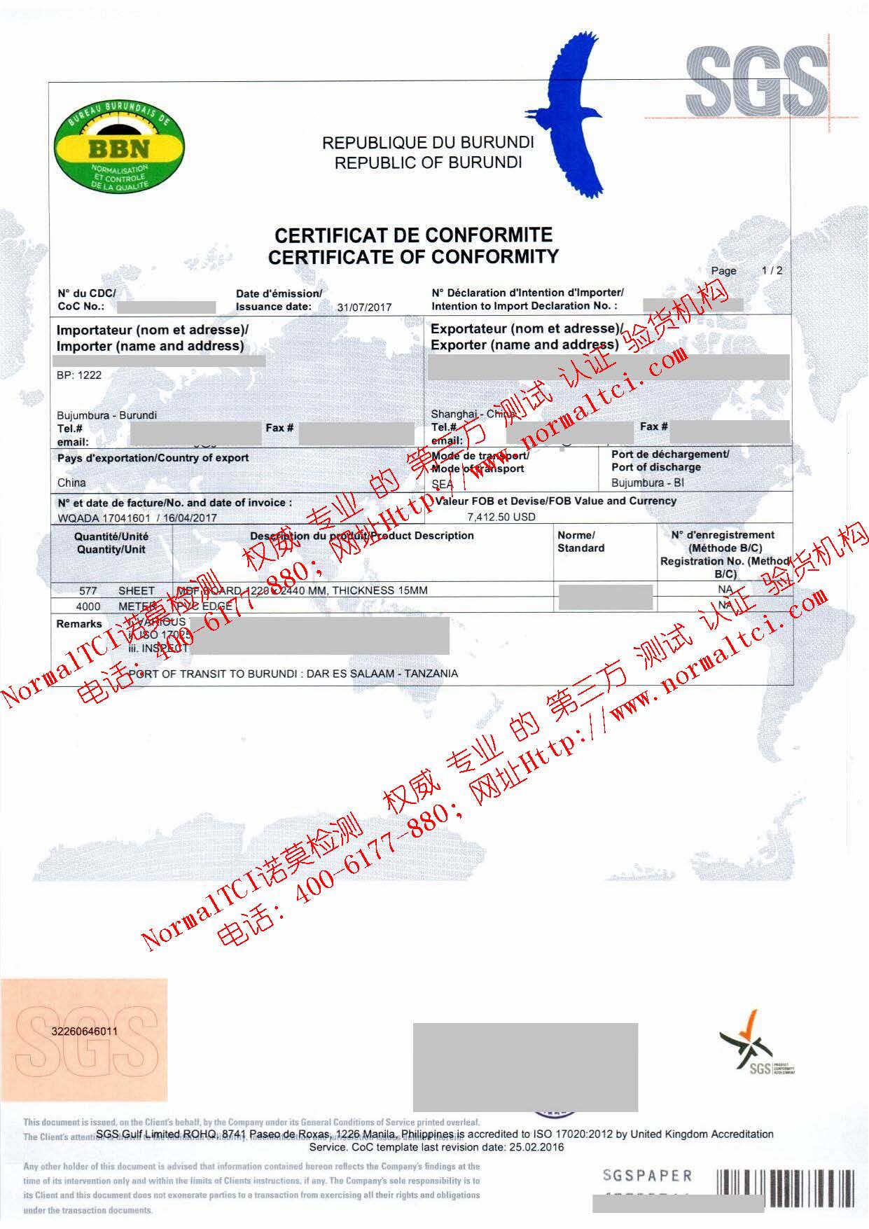 2014年3月15日,布隆迪標(biāo)準(zhǔn)局(Bureau Burundias de Normalisation ,BBN )將實(shí)施裝船前符合性評(píng)定方案 。此方案需要對(duì)所有進(jìn)口到布隆迪的管控產(chǎn)品進(jìn)行評(píng)定,并出具一張符合性證書(shū)(簡(jiǎn)稱(chēng) CoC )來(lái)證明此產(chǎn)品符合適用標(biāo)準(zhǔn)。