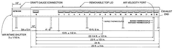 ASTM E84的測(cè)試設(shè)備是一個(gè)隧道爐,長(zhǎng)約7.6m,詳見(jiàn)下圖。