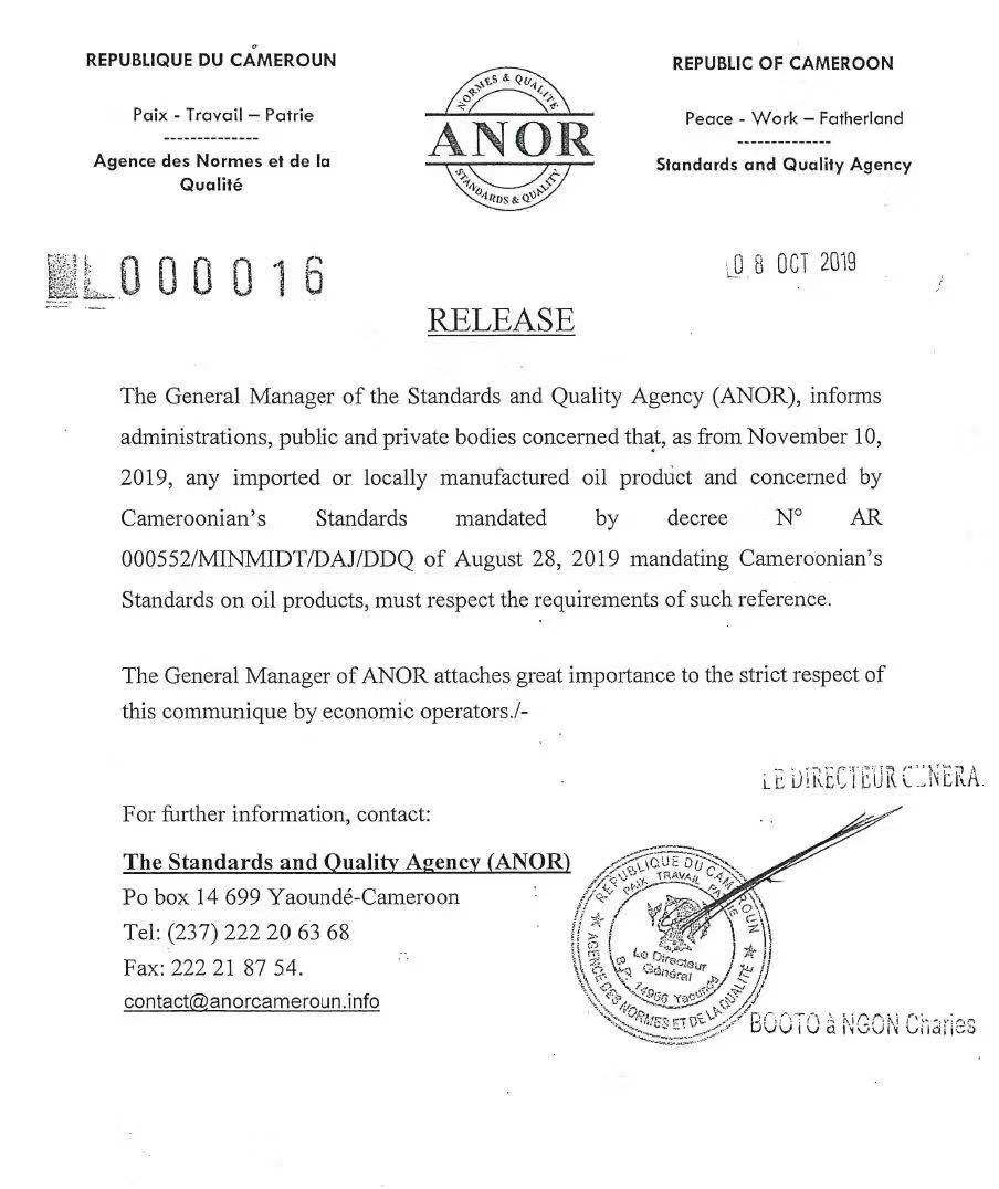 近日,喀麥隆標(biāo)準(zhǔn)與質(zhì)量局ANOR通知喀麥隆裝船前符合性評(píng)估方案 PECAE (Cameroun Pre-shipment Evaluation of Conformity) 更新要求。自2019年11月10日起(合同日期或發(fā)票日期),所有進(jìn)口至喀麥隆或當(dāng)?shù)厣a(chǎn)的且在法令A(yù)R000552/MINMIDT/DAJ/DDQ要求下的喀麥隆標(biāo)準(zhǔn)相關(guān)的石油產(chǎn)品,被列入PECAE的管控范圍內(nèi), 并開始強(qiáng)制執(zhí)行其規(guī)定的產(chǎn)品符合性評(píng)定程序。