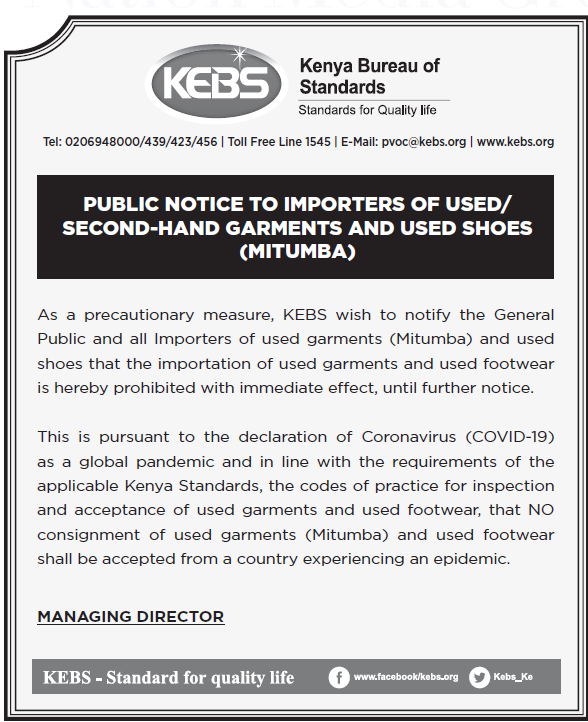 肯尼亞標(biāo)準(zhǔn)局KEBS禁止二手服裝與二手鞋類產(chǎn)品進(jìn)入肯尼亞市場