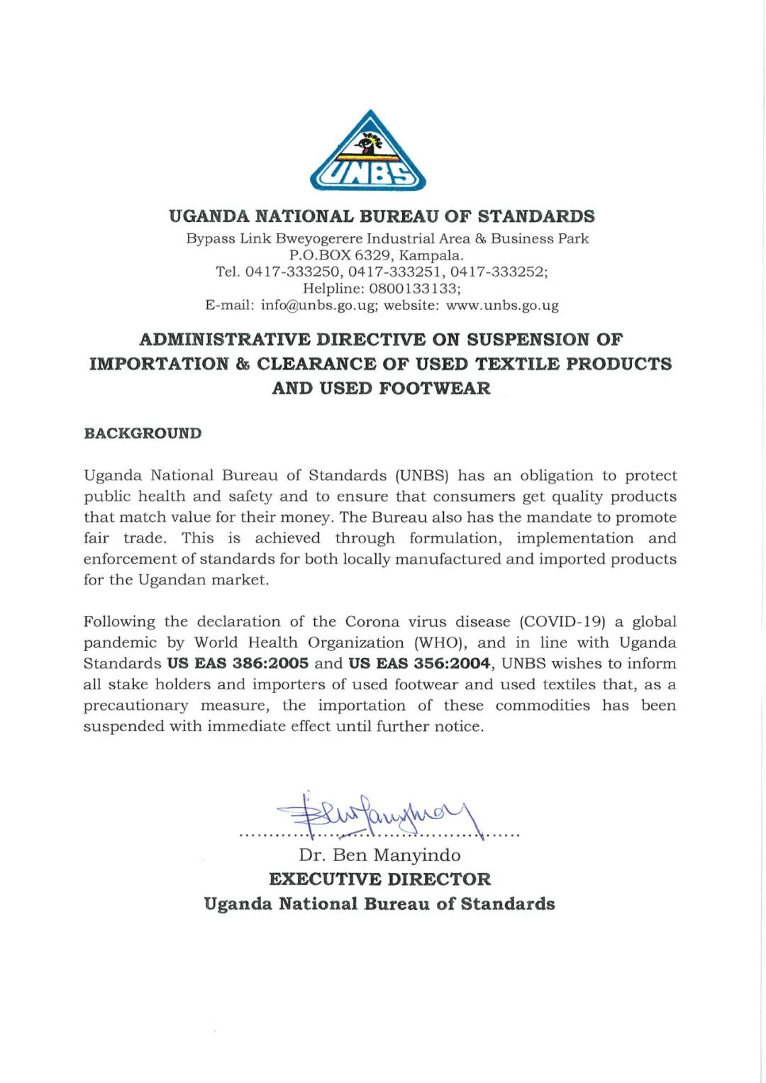 受新冠病毒COVID-19疫情原因,烏干達(dá)國家標(biāo)準(zhǔn)局 UNBS(Uganda National Bureau of Standards)發(fā)布通知,即日起暫停二手服裝,二手鞋類的進口。該要求即時生效。