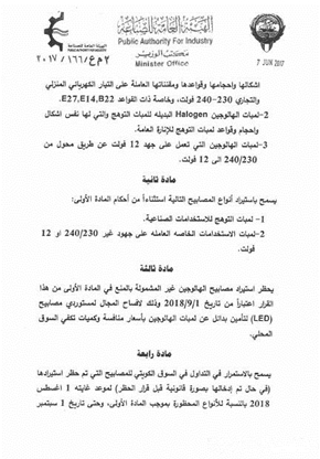 科威特工業(yè)管理局(PAI)近期發(fā)布了一項有關照明產品的最新指令,該指令涉及內的耗電照明產品(鎢絲燈和等效鹵素燈泡的白熾燈泡等)將禁止出口至科威特,并于2017年8月1日起正式實施。