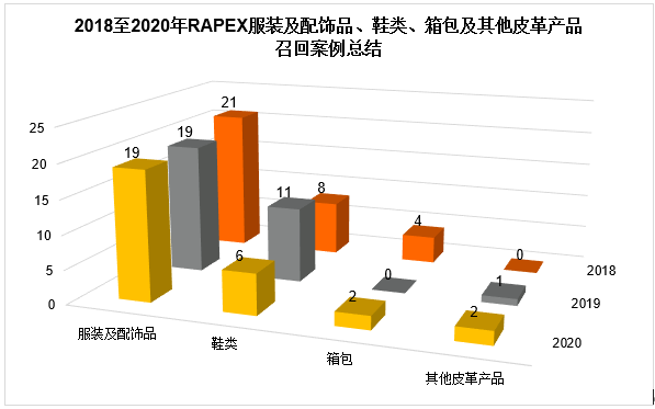 每年由于六價鉻超出3 mg/kg的限值而導致的召回有很多。下圖總結(jié)了2018至2020年RAPEX中公布的由于六價鉻超標造成的服裝和配飾品、鞋類、箱包產(chǎn)品的召回案例的統(tǒng)計。上面的各類產(chǎn)品在三年期間共召回94批次產(chǎn)品。其中,2018、2019和2020年分別召回了33、31和29批次。這些召回給相關企業(yè)造成了非常大的影響和損失。