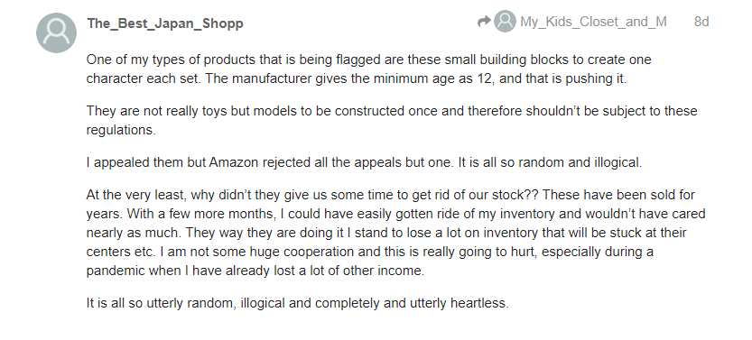 其中一位賣家稱,因產(chǎn)品合規(guī)性調(diào)查,店鋪已經(jīng)有幾百個listing被亞馬遜下架或禁售,而平臺給出的原因為:沒有詳情描述,侵犯專利或外觀設計以及具有安全隱患??善婀种幘驮谟?,這些玩具均出自大型玩具品牌,正規(guī)廠家生產(chǎn),怎么會違規(guī)呢?