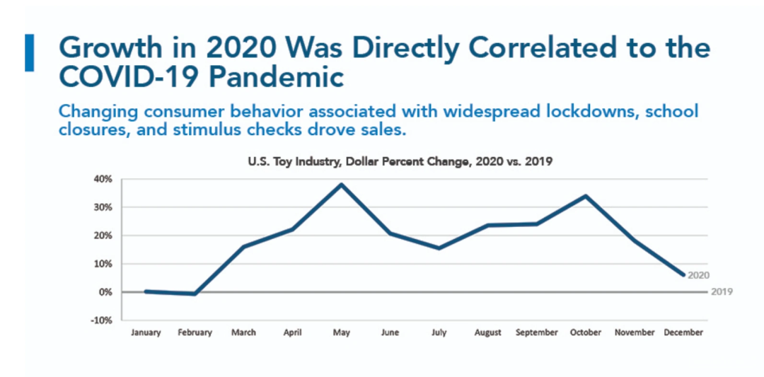 2020年美國玩具銷量大增歸因于學校停課、居家隔離和消費者的線上購物消費行為,因此家庭支出從其他類型的娛樂活動紛紛轉向玩具。