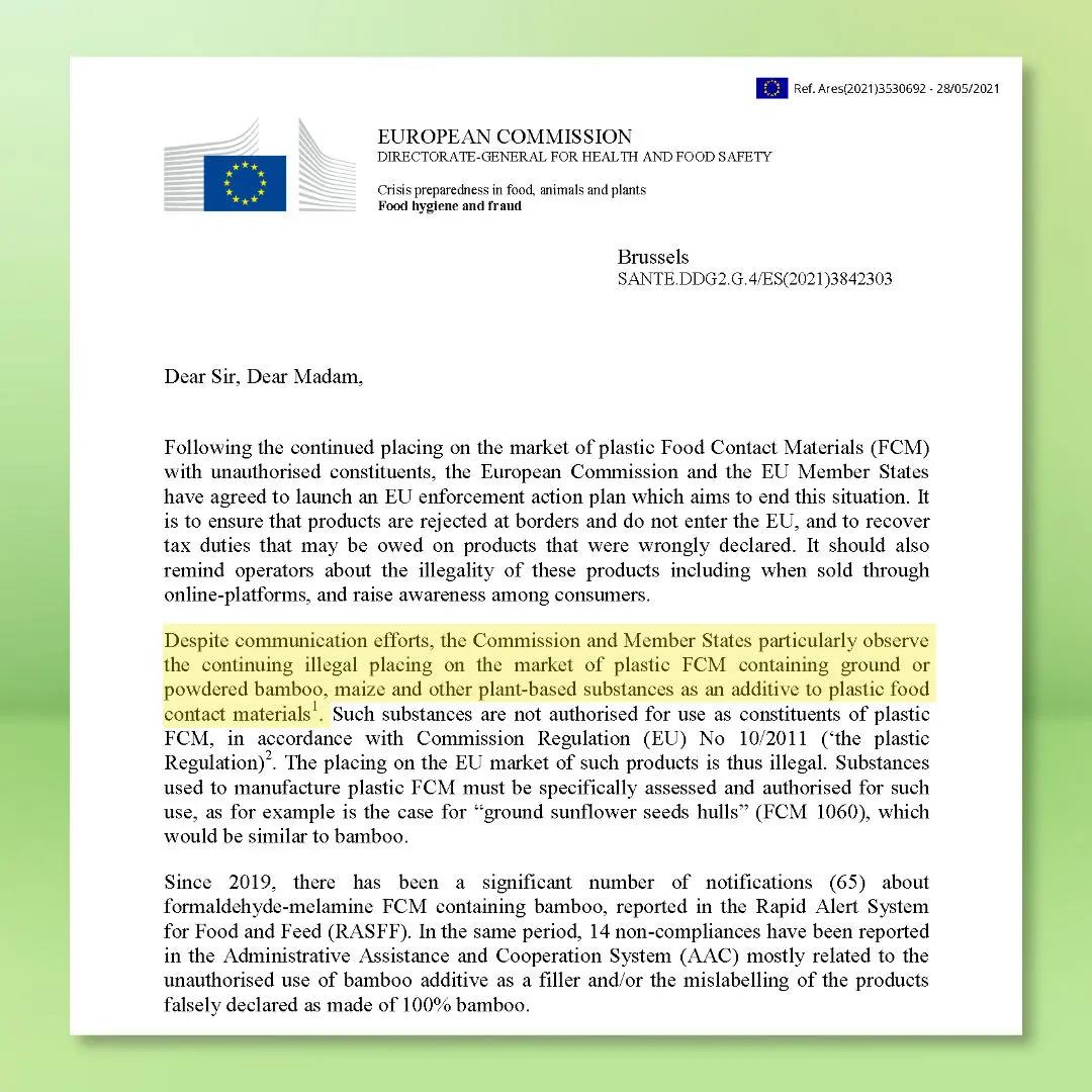 然而2021年5月28日,歐盟委員會通過郵件通知利益相關(guān)者,表示會協(xié)助歐盟成員國啟動“停止含有未經(jīng)授權(quán)的含竹纖維類塑料材料及制品在市場上銷售”的強制計劃。一紙禁令導致相關(guān)產(chǎn)業(yè)急剎車。