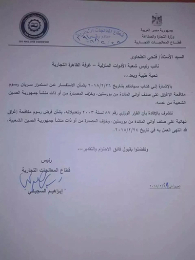 由于埃及進(jìn)口商進(jìn)口的陶瓷餐具在市場(chǎng)售賣價(jià)格高于埃及本國(guó)工廠生產(chǎn)的陶瓷餐具,這導(dǎo)致大部分進(jìn)口商產(chǎn)品滯銷,最后不得不向政府發(fā)文訴苦,隨后政府部門相繼作出以下回復(fù)文章: