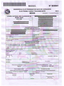根據(jù)貝寧國(guó)法令,凡發(fā)貨至貝寧科托努 (COTONOU) 港或經(jīng)由此港轉(zhuǎn)往其他目的地的貨物都必須申請(qǐng)電子貨物跟蹤單BESC,BESC全稱(chēng)為:BORDEREAU DE SUIVI DE CARGAISON。